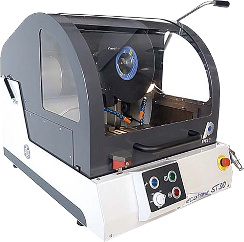 The utilisation of new technology for motor speed control provides constant wheel rotation speed even during the toughest cuts. A choice of 250mm or 300mm diameter cut-off blades coupled with up to 4 pre-set rotational speeds provides the optimum cutting condition for a wide range of materials. The MECATOME ST310 has been designed with the need to be able to easily accommodate samples that are longer than the chamber through the use of removable side ports. Sample set up is easy with the raised âTâ slot bed, large, well lit cutting chamber and wide open access thanks to a fully retracting hood. Observation of the sample during the cutting operation is enhanced with the provision of extra-large windows in the hood.