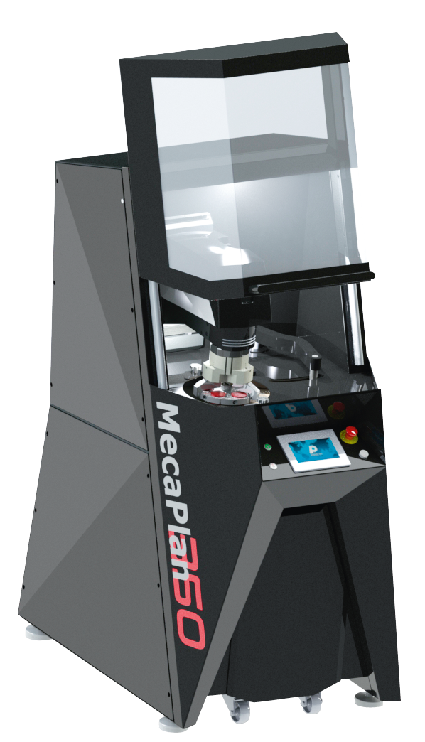 Automatic planar grinding machine. MECAPLAN 350 is an automatic planar grinding machine that allows rapid and extensive removal of material while preserving the integrity of the samples. Powerful and fast, it saves a lot of time and uses less consumables. This machine is particularly suitable for laboratories or workshops that perform tests on many samples.