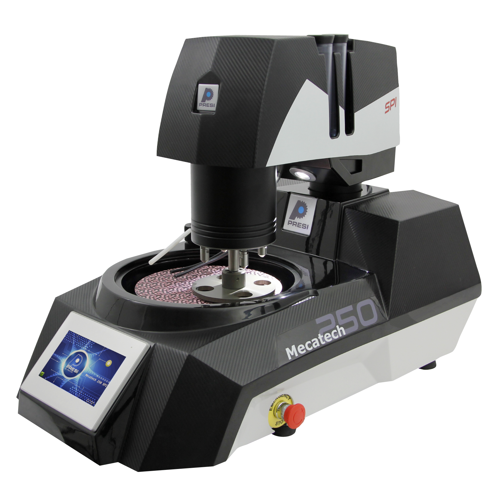 MECATECH 250 SPI is equipped with a Ø 200 to 250 mm platen / 4 pistons / individual pressure. It has the most advanced technologies. The MECATECH range allows both manual and automatic use. Thanks to a motor power from 750W to 1500W, the entire PRESI experience is condensed in this most complete range on the market. Whatever the size or the number of samples, MECATECH guarantees an optimal polishing. With its affirmed style and edged lines, this new range is distinguished by its new design with an easily recognizable sleek and refined carbon look.