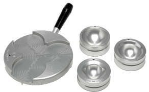 The DrySyn MULTI-E Kit comprises the base plate with heat resistant handle, 3 x 25 mL, 3 x 50 mL and 3 x 100 mL inserts for round bottom flasks. You can also buy these components separately to make up your chosen configuration of inserts. In addition, this base is suitable to use with the DrySyn MULTI-M and MULTI-S flask inserts and vial inserts, offering up to 27 reactions in parallel.