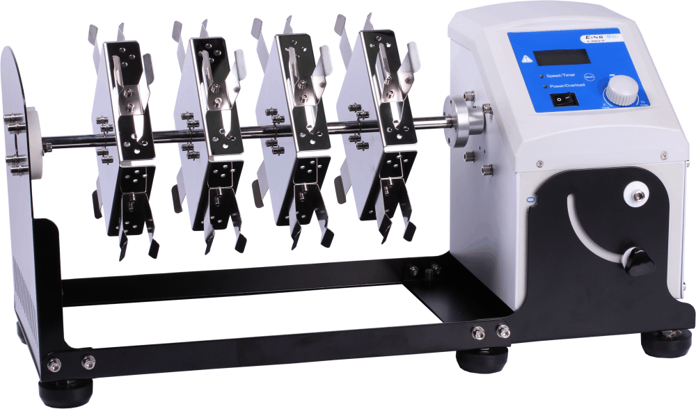The Eins-Sci E-RRM-P rotisserie rotator offers a LCD screen which displays both speed and time allowing for accurate mixing applications. The E-RRM-P has different rotor attachments available to mix various tube sizes. With either vertical or horizontal tube rotor attachments, the E-RRM-P can significantly adjust the vigorousness of the mixing by changing from end over end mixing to a more subtle rolling action. This along with the digital speed control, the Eins-Sci E-RRM-P is one of the most sophisticated rotisserie tube rotators on the market. The Eins-Sci rotisserie tube rotator is ideal for mixing blood samples to avoid coagulation, keeping biological samples in suspension and aerating cultures. Variable speed means that the aggressiveness of the mixing can be adjusted for a specific application.
