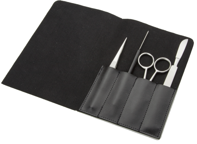 Kit with dissecting needle straight, dissecting forceps, dissecting scissors and scalpel.