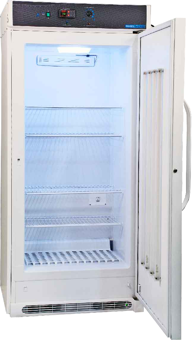 SHEL LAB Diurnal growth chambers are designed for studies requiring day and nighttime simulation. This unit features dual-program selector dials, which allows control of two temperature conditions and an ON/OFF illumination cycle relative to the program selected.