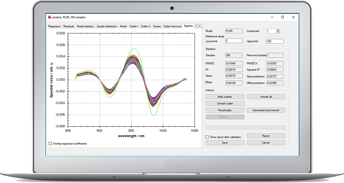 Well-arranged wizard windows give comprehensive assistance and thus even allow the layman to develop a calibration utilising multiple linear regression (MLR) or partial least squares regression (PLSR).